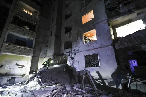 KYIV, Ukraine (AP) — Russia launched new strikes in the Ukrainian city of Kharkiv that hit high-rise apartment buildings, leaving at least 21 wounded in a second consecutive nighttime attack, authorities said.