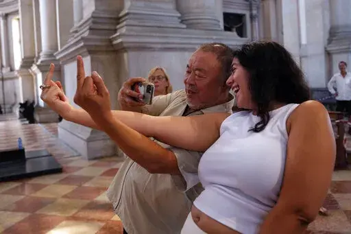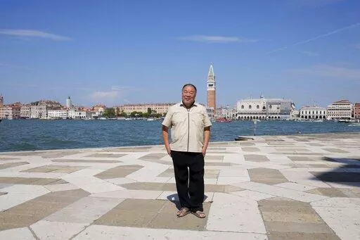 He stands by his 9-meter (29.5-foot), nearly 3-ton black glass sculpture, which is suspended over the central nave of the deconsecrated church of San Giorgio Maggiore, located opposite Venice's St. Mark’s Square. Titled “The Human Comedy: Memento Mori,” the sculpture is the centerpiece of an Ai exhibit at the church that opens Sunday.