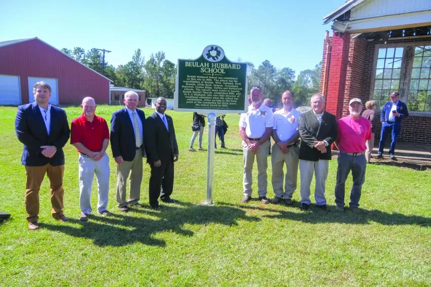 A historic marker was dedicated at the site of Beulah Hubbard School on the cool, crisp morning of Oct. 17. Plans were also unveiled to propose building a community center using the preserved school front and tying it in with a large meeting space in a metal building. The school closed in 1990 when Newton County High School was formed.On hand for the historical marker unveiling were, from left, Glen Harrison, Kenneth Hagan, Ricky Harrison, Brigadier General Kelvin Nichols, Johnny Knochenmuss, Randy Estes, Robert Smith, Mike Smith. | Brent Maze/The Appeal