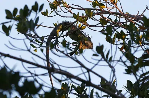 As for iguanas, well, that's another matter. They are an invasive species, well accustomed to the trees of South Florida. When it gets cold, below 40 degrees Fahrenheit about 4 degrees Celsius), they go into a sort of suspended animation mode. And they fall to the ground.