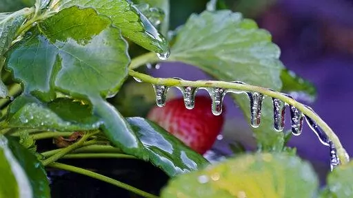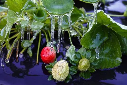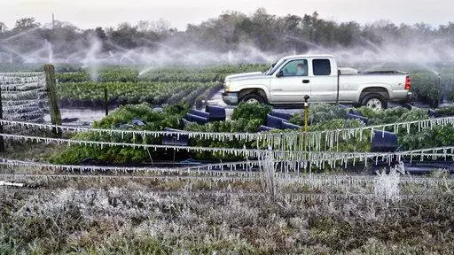 The National Weather Service said Sunday it's all going to warm up nicely after the weekend. The low temperatures near freezing are quite rare in Florida, but at first glance the citrus, strawberry and tomato winter crops suffered no major damage. Farmers spray water onto the crops to help protect them from the cold.