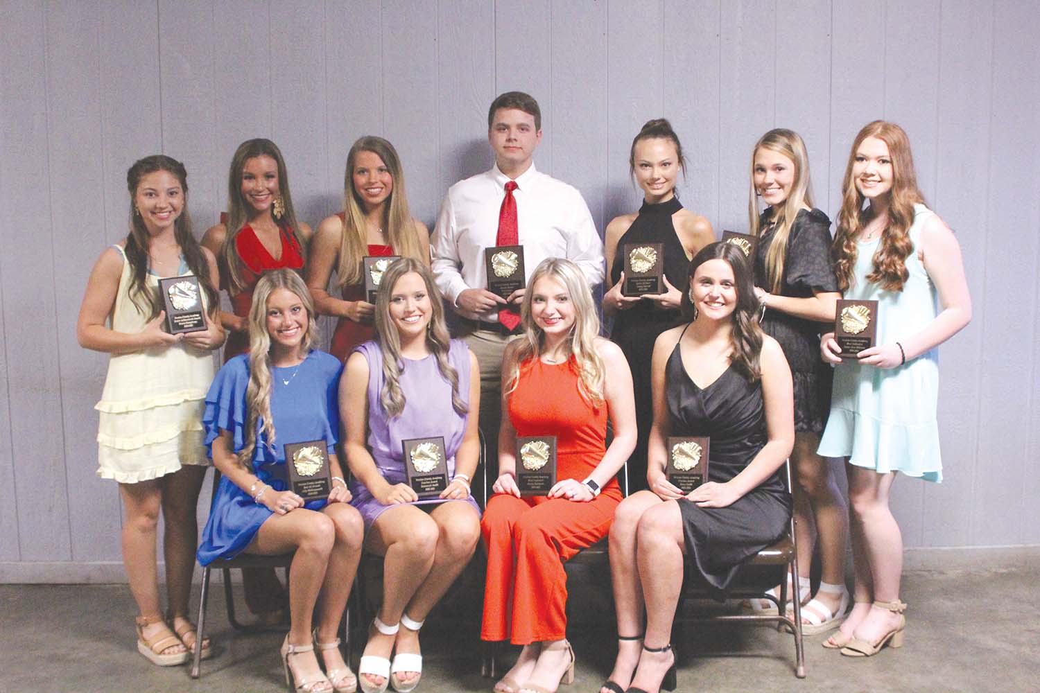Receiving Varsity Cheer Awards included, from left, (Standing) Gracie Humphreys, Senior Achievement; Belle Hollingsworth, Captain; Cayden Alexander, Stunt Award; Neil Garner, Mascot Award; Ashley Barrett, Spirit of Cheer; Madeline Vance, Sophomore Achievement Award; Carlee Bess Williams, Most Dedicated (Sitting) Lilly Hollingsworth, Best All Around; Savannah Smith, Coaches Award; Emma Robinson, Most Improved; and Macy Smith, Coaches Award. Not pictured was Bella Collins, Co-Captain.