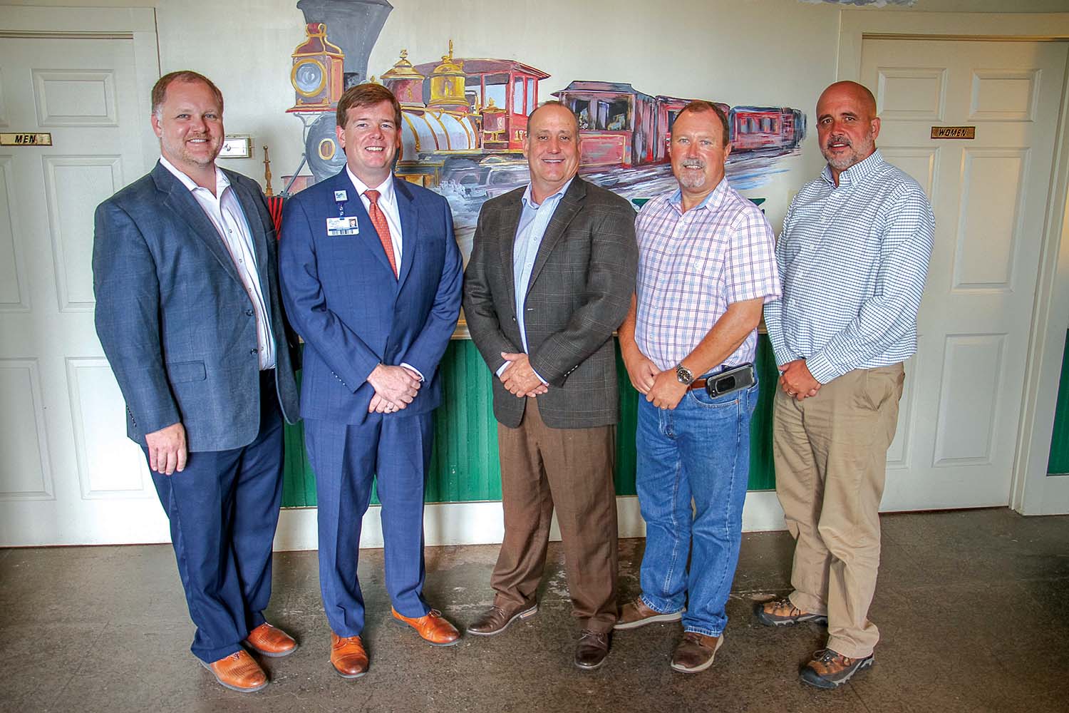 The talk was held during a recent meeting on a Tuesday. Pictured with Kennedy, center left, is State Sen. Tyler McCaughn, left, Union Mayor Brad Capps, center, State. Rep. Randy Rushing, center right, and Mike Butler, right. Kennedy was peaking on the merger with Ochsner.