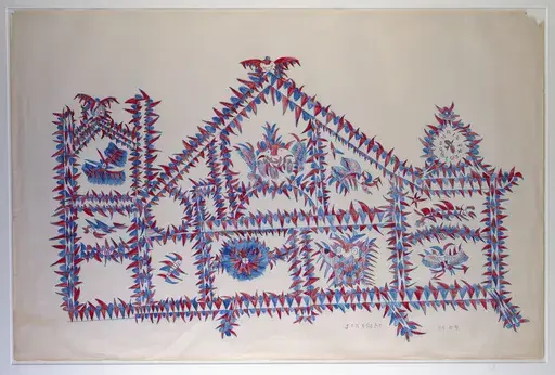 A drawing called “Devil House” conveys what it means when home is a literal prison cell. Incarcerated in a Huntsville, Alabama, prison, Frank Albert Jones started drawing with the red and blue pencil stubs discarded by inmate bookkeepers. A recurring theme is enclosed rooms surrounded by jagged wiry barbs he called “devil’s horns,” with grinning spirits. He frequently includes a clock; for many years, his cell faced the penitentiary’s clock tower.