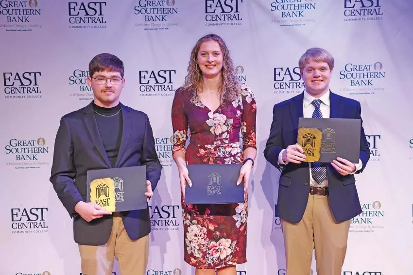 These students were recipients of various humanities awards. Students and their respective awards include (from left) Ethan Bunty of Decatur, Alatha Chaney English Award; Bethany Young of Clinton, L.B. Simmons History Award; and Walker Price of Kosciusko, Sue Yarbrough Fulgham Speech Award.
