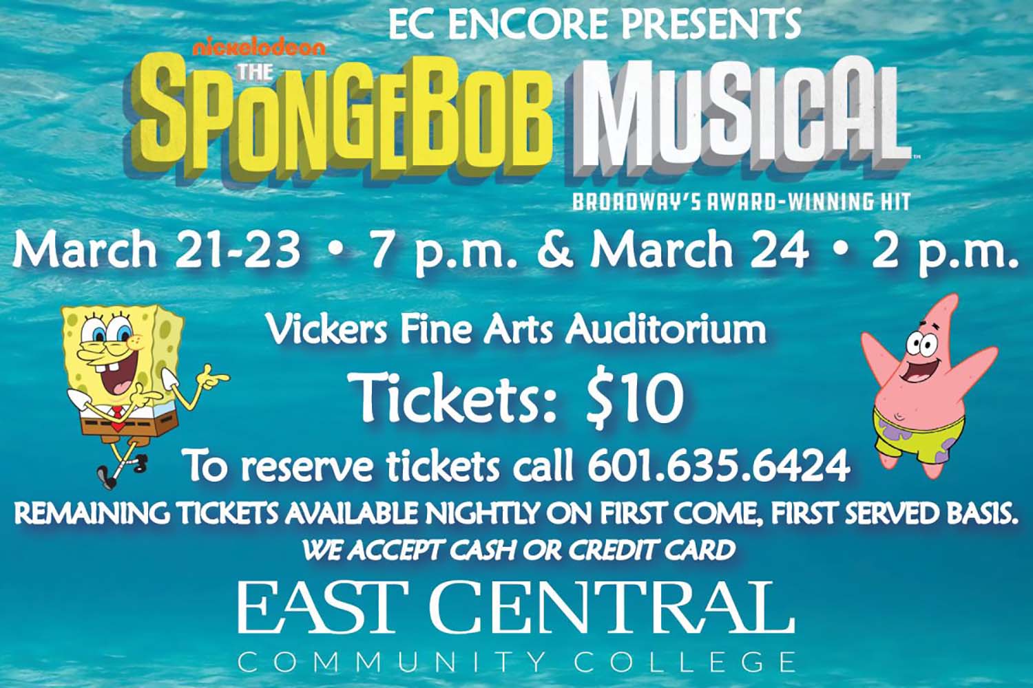 The East Central Community College Encore Players will present “Nickelodeon the SpongeBob Musical” at 7 p.m. Thursday through Saturday, March 21 - 23, and at 7 p.m. on Sunday, March 24 at 2 p.m.