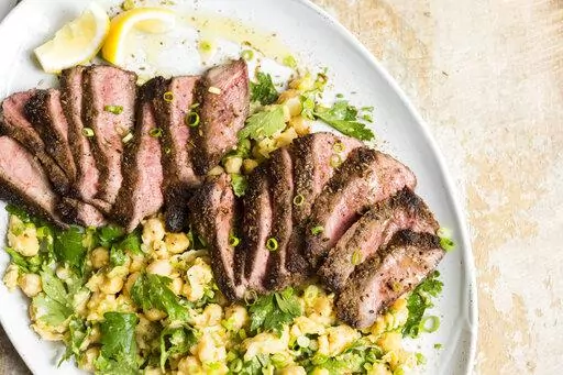Thinly slice the steak against the grain, then arrange the slices on the platter next to the mashed chickpeas. Pour over any accumulated juices and sprinkle with the remaining scallions and the reserved spice mixture. Drizzle with oil and serve with lemon wedges.