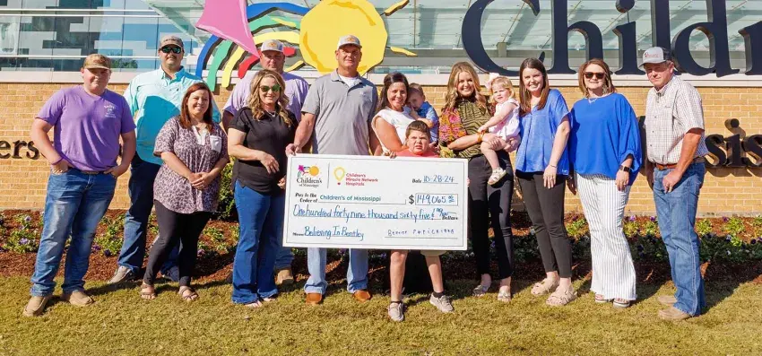 Presenting the donation to Children’s of Mississippi are, from left, Judd Ogletree, Dillon Jeffers, Layci Jeffers, Jamey Johnson, Santana Johnson, Kyle Strickland, Cindy Strickland (holding Nathan Kyle Anderson), Bentley Strickland, Jocie Fowler (holding Whimslee Wilcher), Kaylee Anderson, Kim Strickland and Bryan Strickland. | Courtesy of University of Mississippi Medical Center