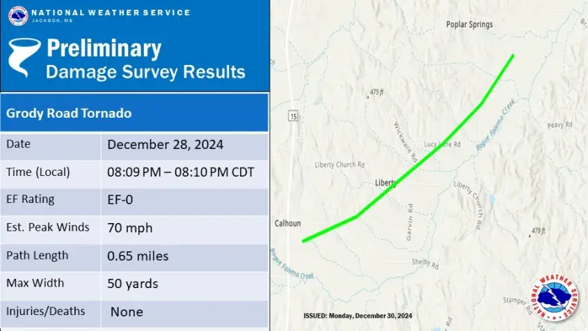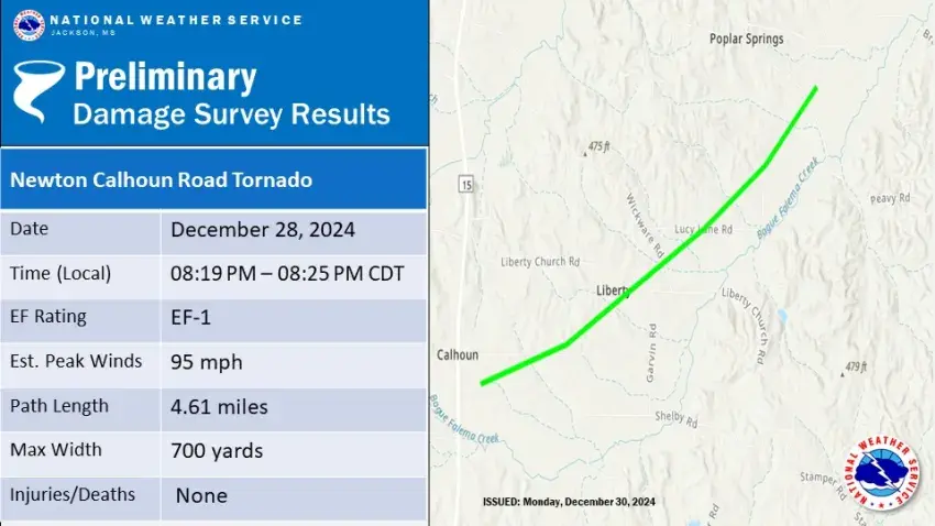 Just south of Newton, a 700-yard-wide EF-1 tornado with peak winds of 95 mph touched down near the intersection of MS Highway 15 and Newton Calhoun Road, traveling northeast for 4.61 miles. The tornado damaged several barns and farm outbuildings, as well as uprooted and snapped many trees along the path before dissipating after crossing Peavy Road.