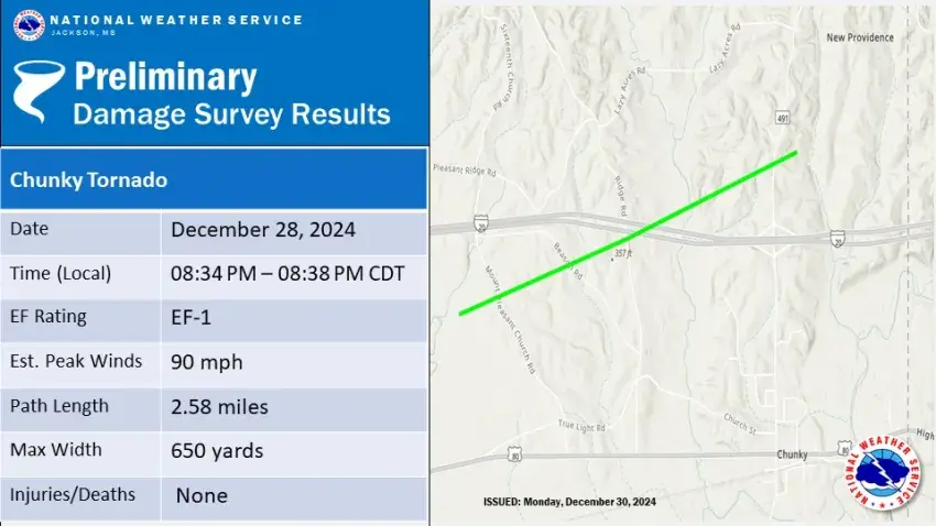 In Chunky, a 650-yard EF-1 tornado, with peak winds at 90 mph, touched down west of Mount Pleasant Church Road and moved north. A home lost its roof, a shed was damaged, and numerous trees were damaged or uprooted along its 2.58-mile track. The tornado crossed Interstate 20 near mile marker 121 and then dissipated after it crossed Chunky Duffee Road.