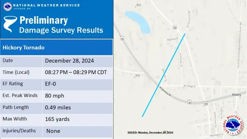 An EF-0 tornado touched down on the west side of Hickory and crossed U.S. Highway 80 and moved northeast for half a mile before lifting as it crossed MS Highway 503. A few buildings were reported damaged, while some minor tree damage occurred with this tornado.