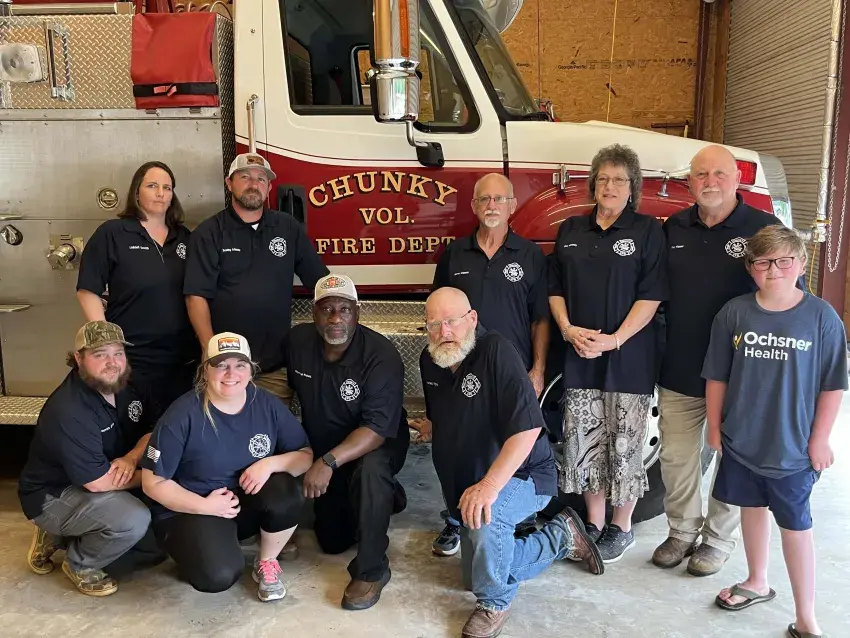 Chunky Volunteer Fire Department Volunteers: Kneeling, l-r, Charles Norris, Kala Alexander, Raymond Pickett, and Darren Garvin. Standing, l-r, Lidell Smith, Scotty Massey, Jamie Massey, Dorothy Massey, Chief Tim Massey, and Cooper Alexander.
