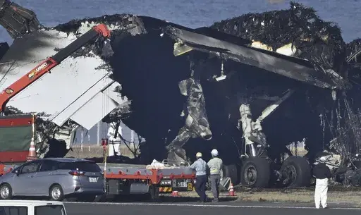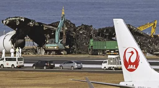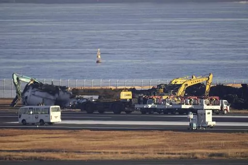 On Saturday, heavy machinery worked for a second day to remove debris of the burned Airbus A350 for storage in a hangar to allow the runway to reopen. Transport Minister Tetsuo Saito said officials were aiming to reopen the runway Monday. Wreckage of the Japan Coast Guard plane had been cleared.