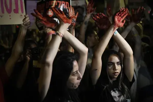 The crowd marched through central Jerusalem and gathered near Prime Minister Benjamin Netanyahu’s residence. Many blew horns, held posters of captive hostages and chanted anti-Netanyahu slogans and called on him to to resign.