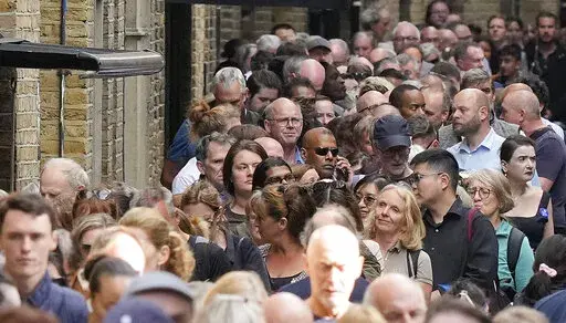 Authorities said the line on Thursday stretched about 2.6 miles (4.2 kilometers) along the south bank of the River Thames.