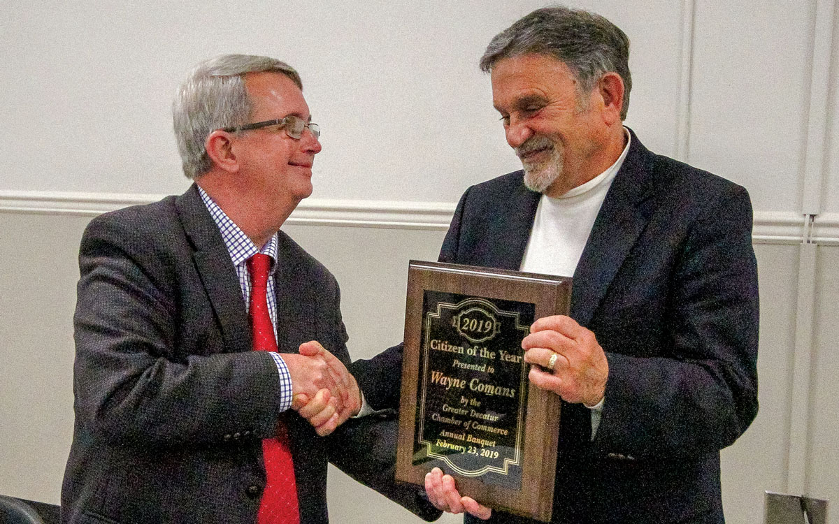After the long introduction, businessowner Wayne Comans was announced as the Decatur Citizen of the Year Saturday at the East Central Community College Cafeteria. As Buckley said, Comans has been in Decatur “around a thousand years” and is one of the most giving people in town and would give the shirt off of his back.