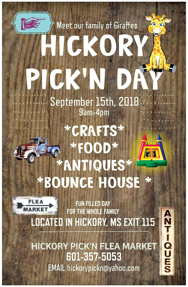 Vendor applications, which cost $30, can be picked up at Hickory Pick’N, 9560 MS 503, by calling Hickory Pick’N at 601-357-5057 or via email, hickorypickn@yahoo.com.