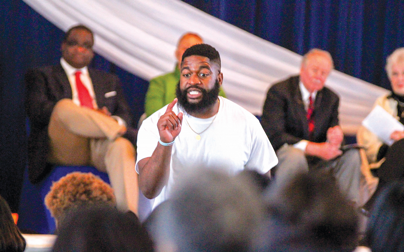 Former Ole Miss linebacker/defensive end D.T. Shackelford was the invited guest of Newton High School alumnus Bruce Ware to help celebrate the NHS Grisham Fellows Program Friday at the NHS auditorium.