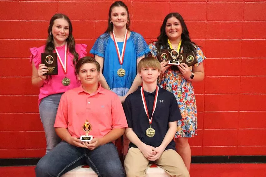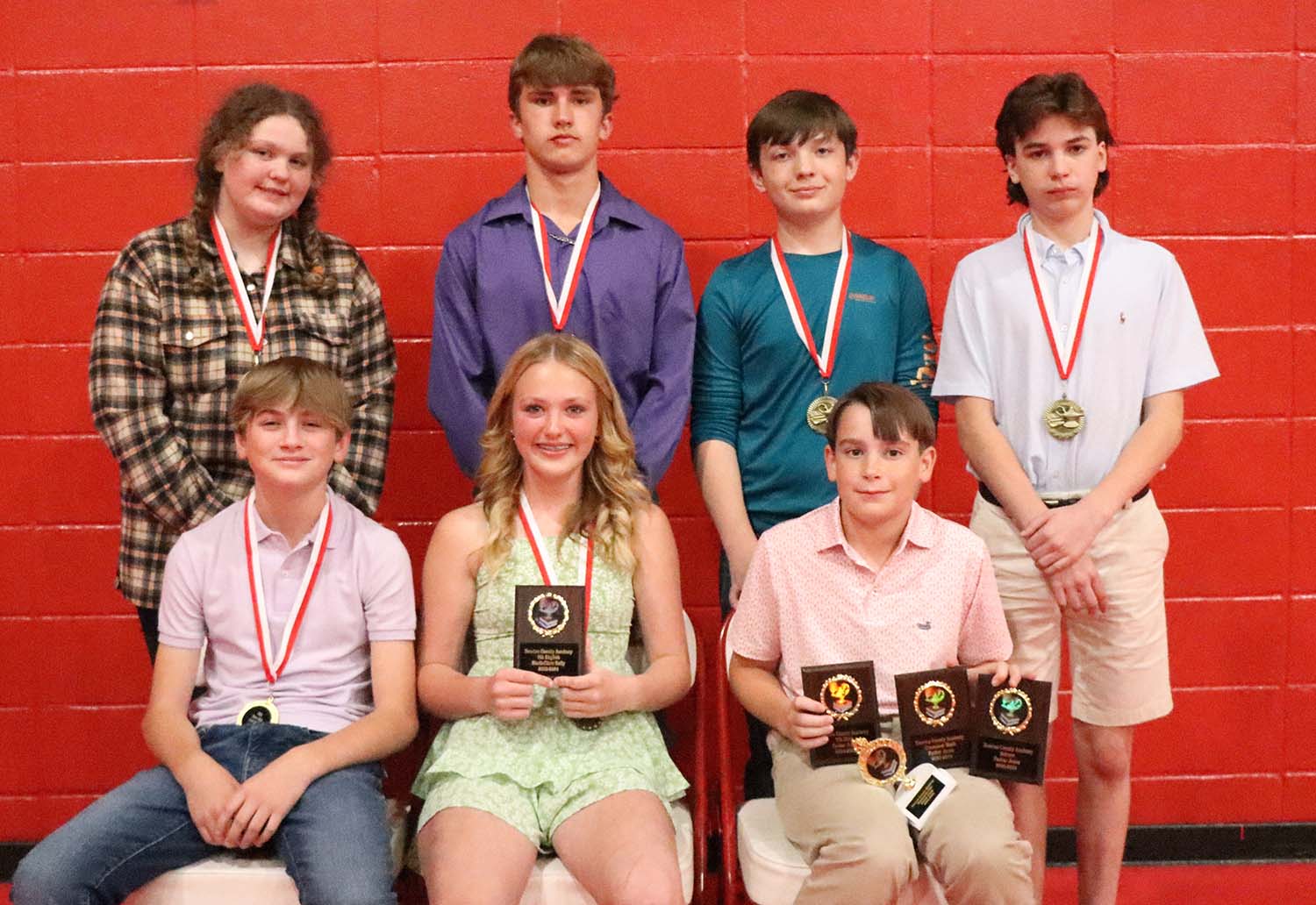NCA 7th Grade Awards:(Sitting, l-r): Cash Weems, Honor Roll, Marli-Clare Kelly, 7th English, Honor Roll, Parker Jones, Science, 7th Math, Consumer Math, and Headmasters List. (Standing, l-r) Olivia Morgan, Honor Roll, Elijah Herrington, Honor Roll, Saxtyn Hollingsworth, Honor Roll, Huck Newman, Honor Roll. (Not Pictured: Samantha Williams, History, Bible, and Honor Roll, Hannah Mayo, Headmasters List)