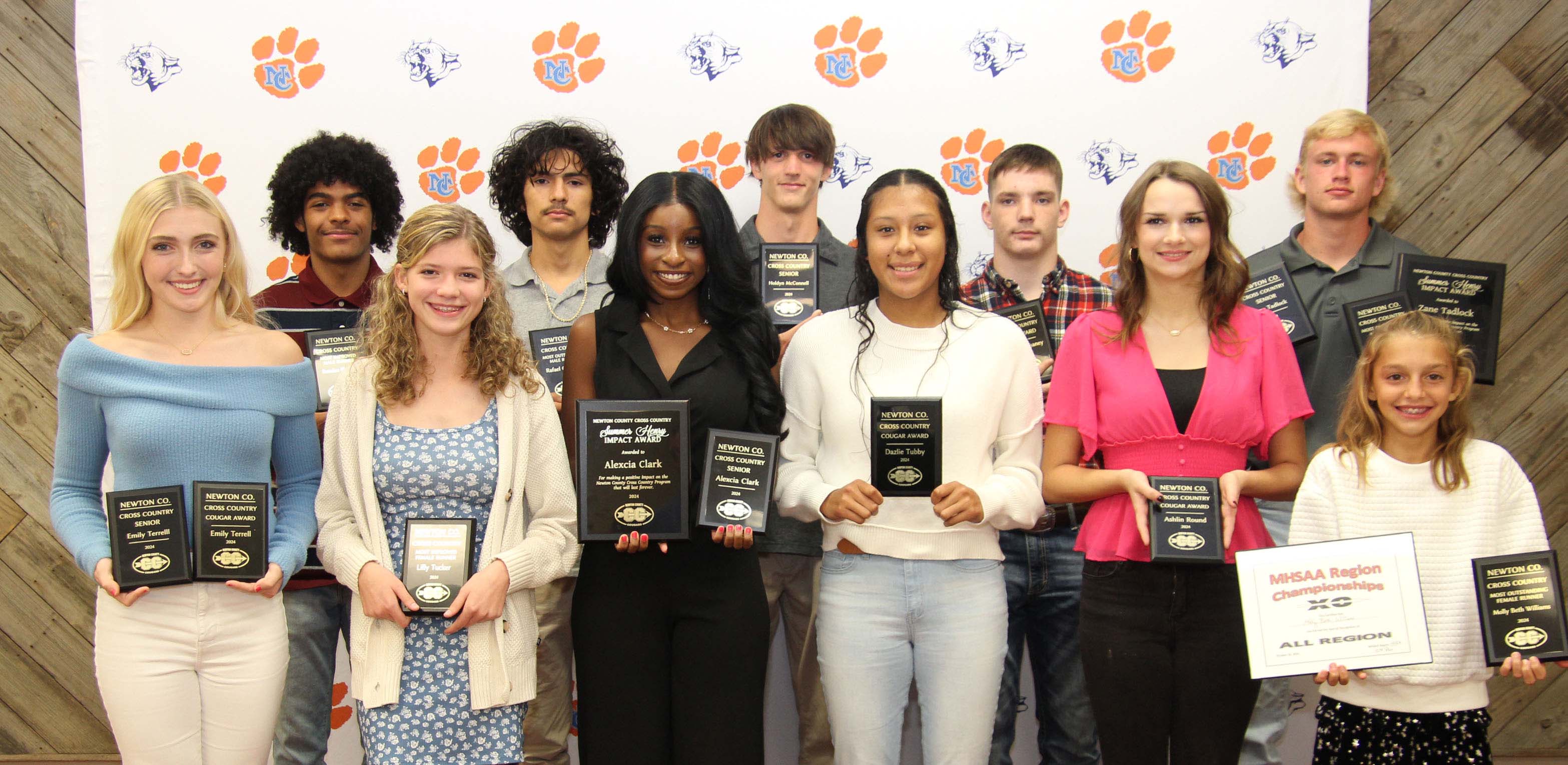 The Newton County Cross Country season concluded with a banquet celebrating the accomplishments of these athletes front row from left: Emily Terrell, Senior Award and Cougar Award; Lilly Tucker, Most Improved Female Runner and Cougar Award; Alexcia Clark, Senior Award and the “Summer Henry” Impact Award; Dazlie Tubby, Cougar Award; Ashlin Round, Senior Award and Cougar Award; and Molly Beth Williams, Most Outstanding Female Runner; back row from left: Brendon Blaylock, Most Improved Male Runner; Rafael Cervantes, Most Outstanding Runner; Holdyn McConnell, Senior Award; Harrison Chaney, GRIT Award; and Zane Tadlock, Senior Award, Most Outstanding Male Runner, and the “Summer Henry” Impact Award. Also recognized: Dasan King, Senior Award; and Shae Jimmie, GRIT Award. The team is coached by NC Head Coach Michael Franklin and NC Assistant Coach Richard Burton.