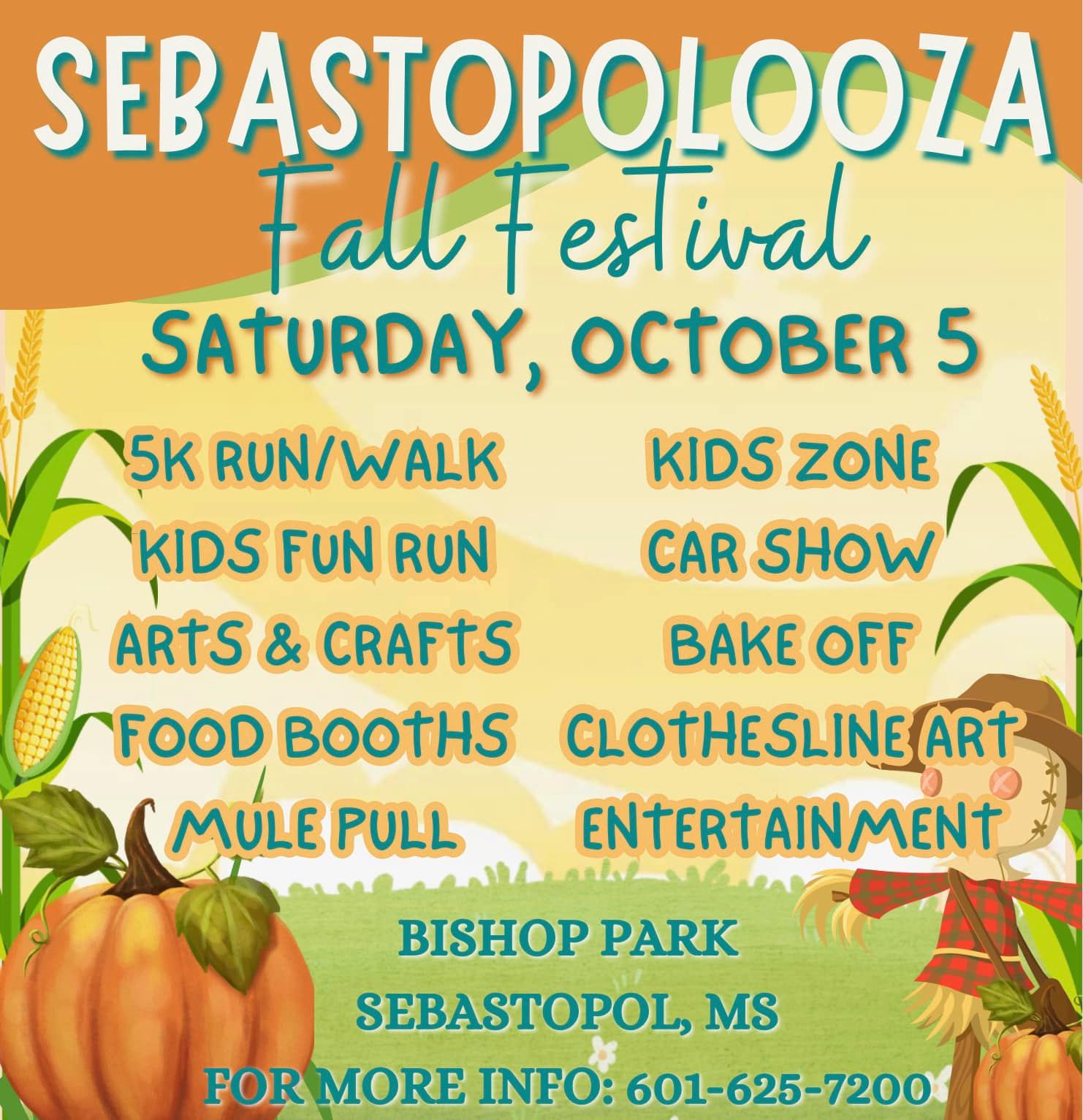 The 2024 Sebastopalooza Fall Festival will be Saturday, Oct. 5, at Bishop Park in Sebastopol. There will be a 5K Run/Walk, Kids Zone, Kids Fun Run, Car Show, Arts & Crafts, Bake Off, Food Booths, Clothesline Art, Mule Pull, and Entertainment. For more information, contact 601-625-7200.