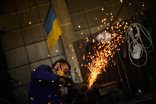ZAPORIZHZHIA, Ukraine (AP) — Sparks fly as a circular saw slices into metal, while welders nearby work feverishly to the sound of blaring heavy metal. Upstairs, sewing machines clatter as women mark patterns on cloth being shaped into bulletproof vests.