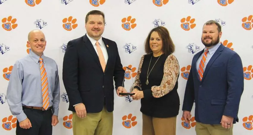 Dr. Tyler Hansford, Superintendent of the Newton County Schools, presented Newton County Elementary School Second Grade Teacher, Dawn Harrison, with the District Teacher of the Year Award for the 2023-24 school year from left: NCES Principal Jason Roberson, Dr. Hansford, Mrs. Harrison, and NCES Assistant Principal John May.