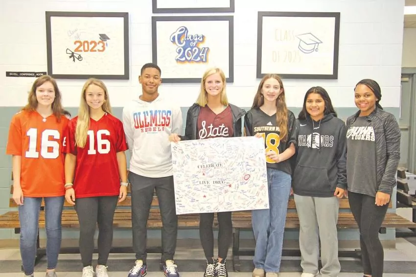 Students at the Newton County Career and Technical Center participated in a Drug-free Commitment Signing during Red Ribbon Week, teaming up against drugs from left: Carlee Ford, Mikala Townsend, Satchel Oliphant, Kaylee Avant, Mary Lee Gregory, Zahayliah Bell, and Aaliyah Dawkins Allen.