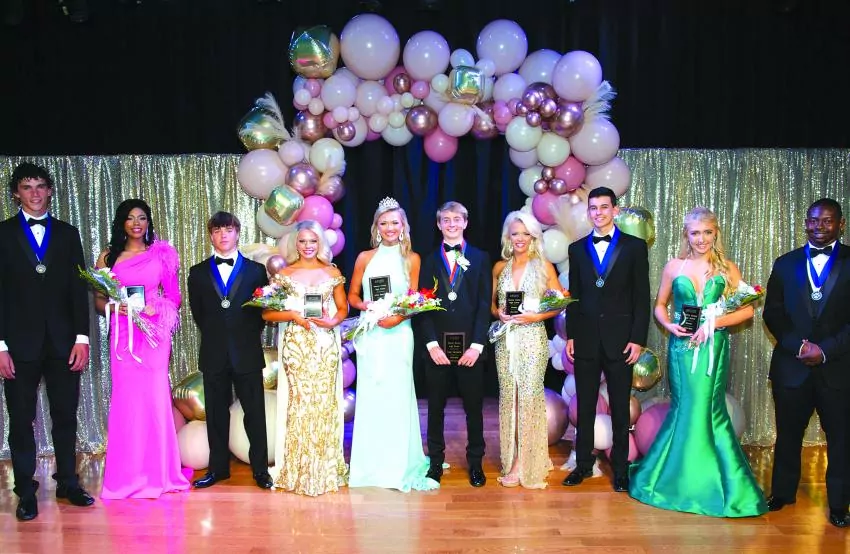 The winners of the Newton County High School Beauty and Beau Revue include from left: Jayden Butler, Madalyn Oliphant, Camden Thoms, Skylar Patricola, Most Beautiful Adison Hollingsworth, Most Handsome Tate Baucum, Alli Claire Amis, Gabe McCarty, Emily Terrell, and Jeremiah Thames.