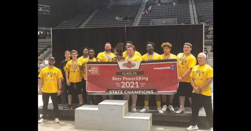 Members of the Union Powerlifting Team, which won the Class 2A Boys State Championship Saturday at the Jackson Memorial Coliseum, includes, from left Coach Jay Cassel, Zeus Thompson, Drew Sharp, Jaheim Gill, Carlos Hickmon, Jacob Moore, Raylond Nettles, Alex Sharp, Zach Collins, John O’Neal, Brandon Killens, Alec Pientowski and Coach Daryl Jones.