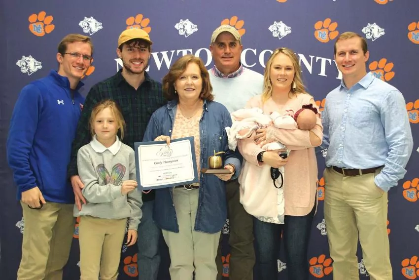 Cindy Thompson poses for a photo with her family after she received a Golden Apple Award. On hand for the occasion included, from left, Will Thompson, son; Parker, granddaughter; Samm Thompson, son; Cindy Thompson, Golden Apple winner; Kenneth Thompson, husband; Sara, wife of Will Thompson; Coleman, granddaughter; and Russ Thompson, son.