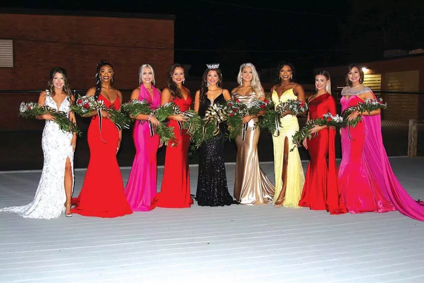 Members of the 2020 Homecoming Court at East Central Community College in Decatur included (from left) freshman maids Emma Fulcher of Louisville, Kenayzha Germany of Union, Carlie Kitchings of Decatur, and Alex Weir of Newton; 2020 Homecoming Queen Courtney Gill of Carthage; and sophomore maids Olivia Adams of Philadelphia, Jasmin Brooks of Coll