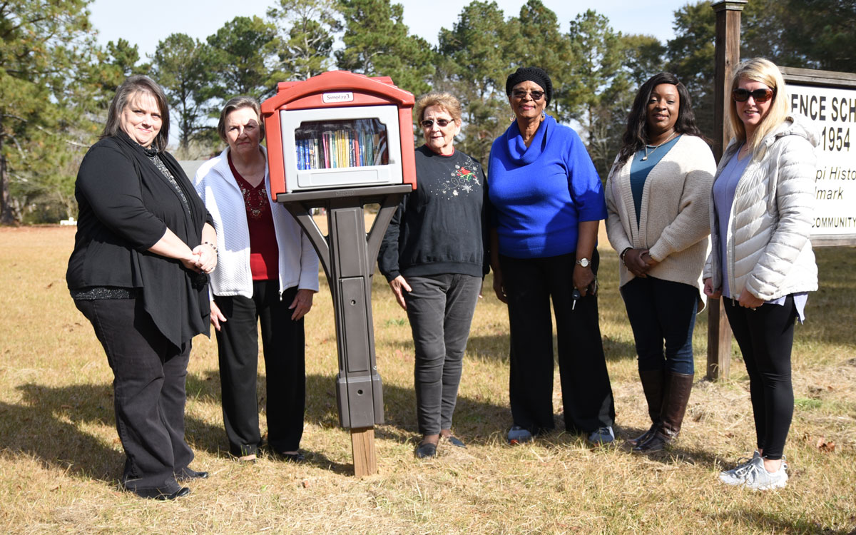 Club members invited two members of the Mississippi State Extension office to join them for a picture of the new library. Left to right: Club members: Ramona Burton, Jean Burton, Sudie Merriwether, Elaine Moss, along with Extension office members: Katrina McCalphia, and Leanne Kilgore were present for the picture.
