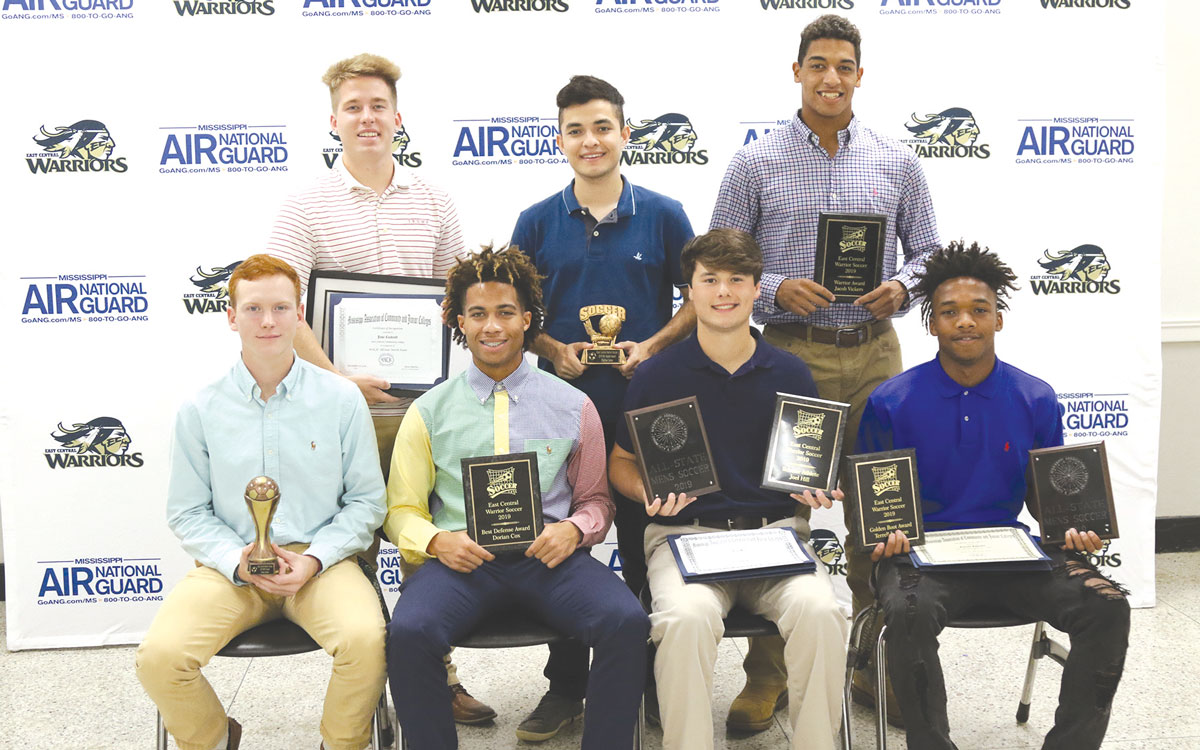 East Central Community College men’s soccer players honored at the 2019 Fall Sports Awards Banquet held on the campus in Decatur, and their respective high schools, include (front row, from left) freshman goalkeeper Chase Graham of Vicksburg Warren Central, Most Valuable Player; freshman forward/midfielder Dorian Cox of Jackson Jim Hill, Best Defense Award; sophomore midfielder/defender Joel Hill of Newton County, Scholar-Athlete Award, Team Captain, Mississippi Association of Community and Junior Colleges All-Conference, and MACJC All-Star Team; and sophomore midfielder Terrell Johnson of Jackson Murrah, Golden Boot Award, MACJC All-State, and MACJC All-Star Team; and (back row, from left) sophomore midfielder Jake Cockroft of Kosciusko, MACJC All-Star Team; freshman midfielder Raphael Salles of San Paulo, Brazil, Hustle Award; and freshman goalkeeper Jacob Vickers of Biloxi, Warrior Award. The Warriors also received the MACJC Tom Shepard Award for sportsmanship. (EC Photo).