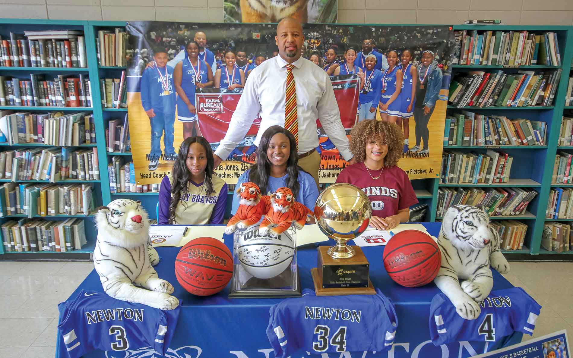 Newton’s Nia McCalphia, Myja McNichols and McKinley Ware each signed basketball scholarships last week in a ceremony at the Newton High School library.