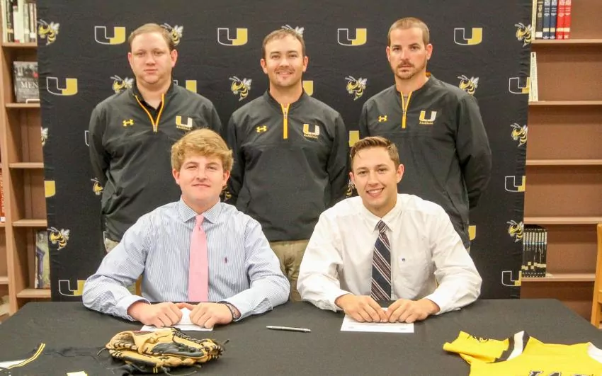 Seated, Hunter Morris, left, and Lane Hanna, right, both signed scholarships with Co-Lin Community College. On hand for the signing were Union coaches WT Smith, Dustin Hamrick and Zach Robinson. (Brent Maze/The Appeal)