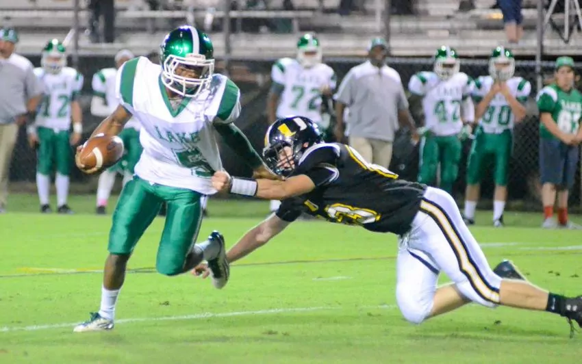 Lake's Johnny Johnson tries to elude a Union tackler during a game earlier this season. (Jim Ogletree/Special to The Appeal)