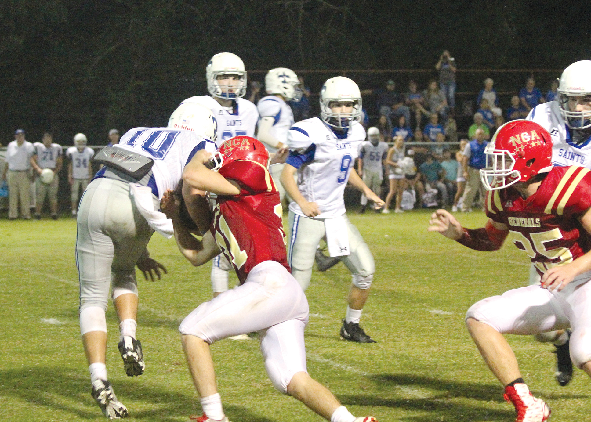 The second half didn’t start out well as the Generals were forced to punt but snapped it over the punter’s head, giving the Saints the ball at the NCA 15. But Bounds came up big again as he intercepted a Sylva Bay pass at the goal.