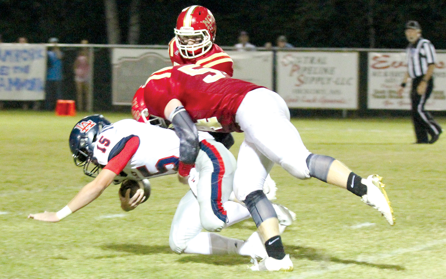 After NCA turned the ball over on downs, Leake’s Will-Lawson Harkins hit Matt Clair on a 21-yard touchdown pass with 11:09 left in the first half for a 28-0 lead.