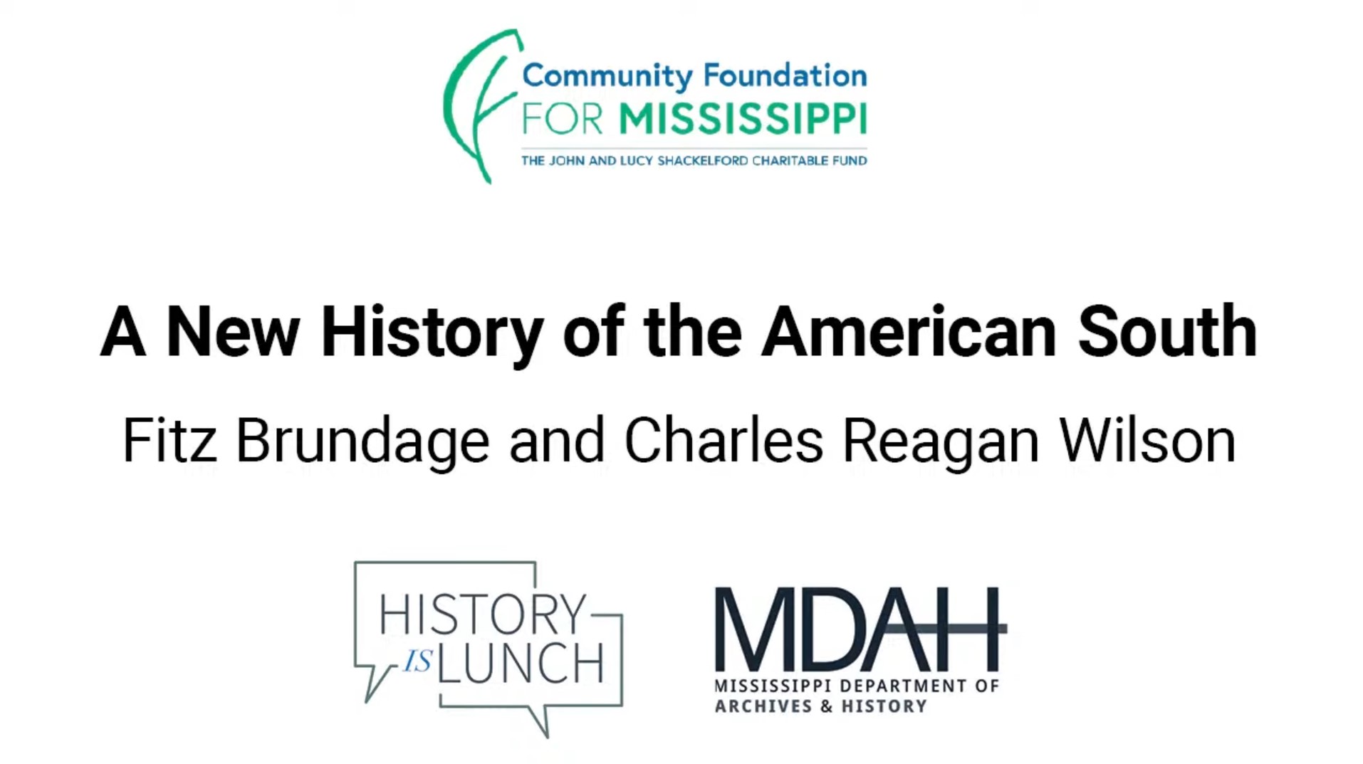 History Is Lunch is sponsored by the John and Lucy Shackelford Charitable Fund of the Community Foundation for Mississippi. The weekly lecture series of the Mississippi Department of Archives and History explores different aspects of the state's past. The hour-long programs are held in the Craig H. Neilsen Auditorium of the Museum of Mississippi History and Mississippi Civil Rights Museum building at 222 North Street in Jackson and livestreamed on YouTube and Facebook.