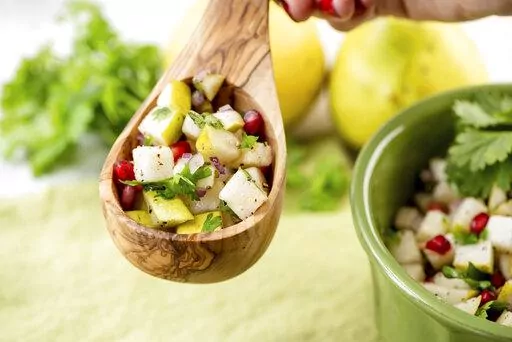 In a medium bowl, combine 2 diced ripe-but-firm pears, a minced ½ red onion, a couple of tablespoons pomegranate seeds, 1 teaspoon minced jalapeno, 1 tablespoon minced fresh cilantro, 1 tablespoon lemon juice, 1 tablespoon orange juice, and salt and pepper to taste.