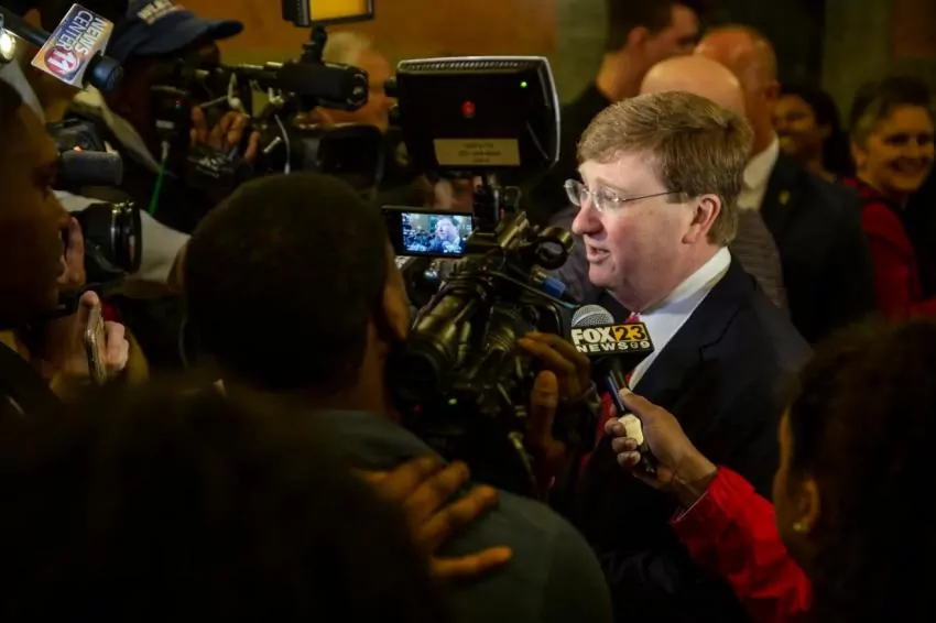 Mississippi House speaker Philip Gunn, center, and Lt. Gov. Delbert Hosemann, right, talk after Gov. Tate Reeves press conference at the State of Mississippi Woolfolk Building in Jackson, Miss., Thursday, May 7, 2020. Credit: Eric J. Shelton/Mississippi Today