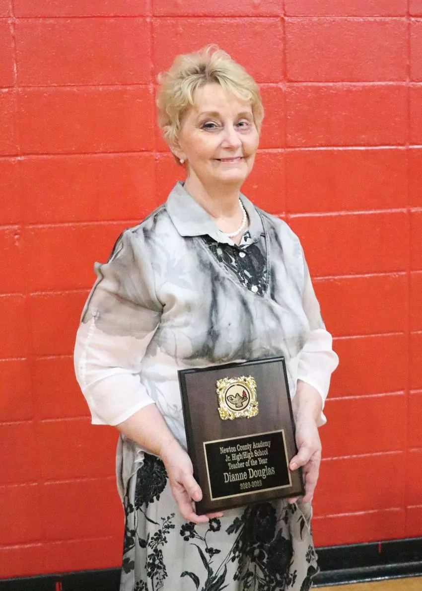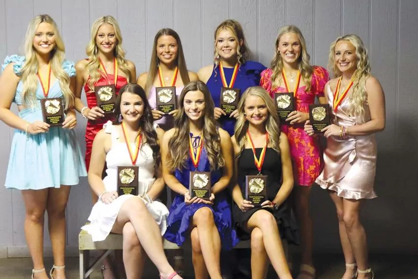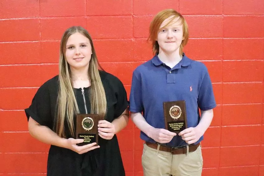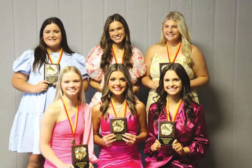 Newton County Academy student-athletes receiving junior varsity cheer awards included, from left, (standing) Addison Godwin, Spirit of Cheer; Maggie Vance, Stunt Award; Celi Weems, Most Spirited; (Sitting) Karlie Stamper, Captain and Best tumbler; Allee Anderson, Co-Captain; and Valyn Crosby, Most Improved.
