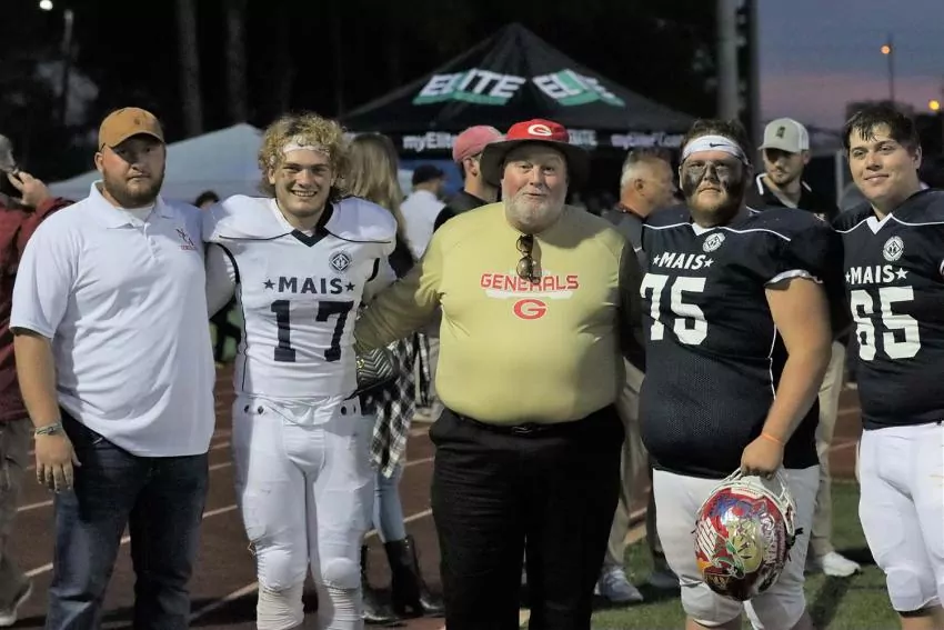 Colby Hollingsworth, Trey Mathis and Braxton Therrell represented Newton County Academy in the Mid-South Association of Independent Schools All-Star Football Game on Friday, Dec. 3. Pictured are, from left, Assistant Coach Dalton Hollingsworth, Colby Hollingsworth, Head Coach Steve Nelson, Trey Mathis, and Braxton Therrell.