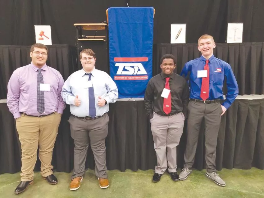 These four Engineering students from Newton County Career and Technical Center participated at the District Technology Student Association (TSA) Competition in Vicksburg, Mississippi, this week from left: Brandon Allen, Joey Churylo, Jorden Williams, and Reese Eldridge. Glen Harrison is the NCCTC Engineering Instructor.