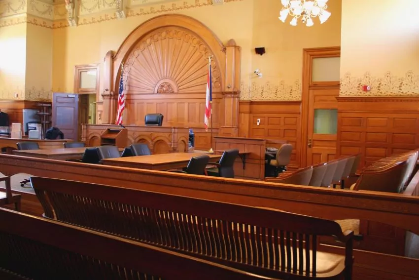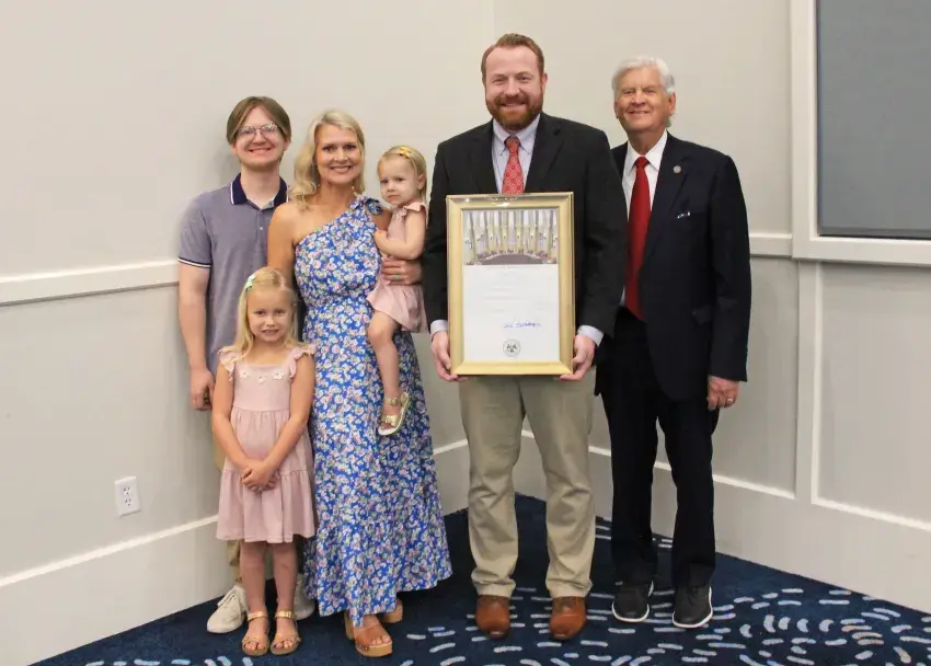 Mississippi Electronic Courts Director Nathan Evans of Gluckstadt, second from right, holds the 2025 Chief Justice Award. Chief Justice Mike Randolph is at right. Pictured at left are children Braden and Addison, and wife Megan Evans holding their youngest child, Lily.