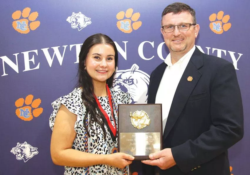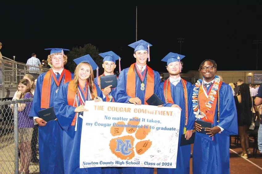 Members of the Newton County High School Class of 2024 hold the banner they signed as freshmen in the fall of 2019. The Cougar Commitment banner reads, “No matter what it takes, my Cougar Commitment is to graduate,” a component of the NC Drop-out Prevention Plan, which encourages students to set and reach goals.