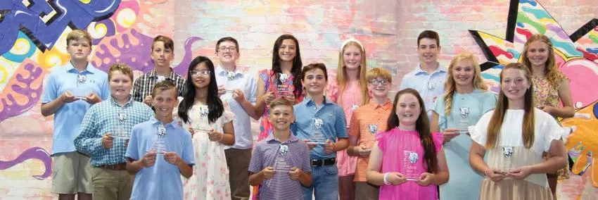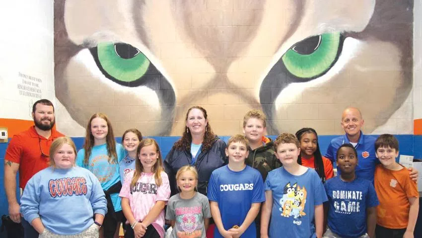 The 2023-24 Super Cougars of Newton County Elementary School include front row from left: Hollis Thompson, Tripp Thoms, Aubree Gray, and Emma Ward; second row from left: Loper Bounds, Hannah Lin, Clark Comans, Carter Franklin, and Addison Posey; back row from left: Seth Hollingsworth, Bryce Hughes, Jack Clark, Addyson Lofton, E