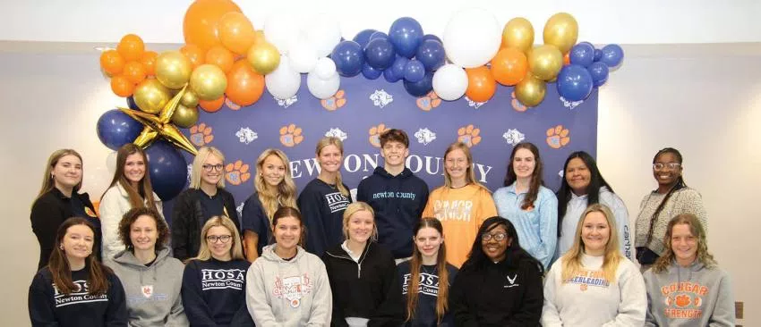 The Newton County Career and Technical Center Health Sciences Completers for the 2023-24 school year include front row from left: Aubrey Flint, Emma Claire Thornton, Maylee Lockley, Brelie Phillips, Brooklyn Boykin, Bryanna Gann, DyAsia Lampkin, and Aubrey Kate Hayes; back row from left: Morgan Chaney, Annalyse Russell, Lacie Posey,