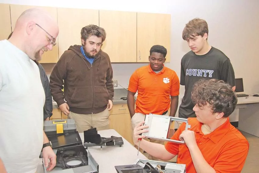Newton County Career and Technical Center Information Technology Second Block students take the opportunity to troubleshoot a desktop computer from left: NCCTC Information Technology Instructor Jody Chaney with students, Dalton Hussain, Jorden Williams, Carson Pierce, and Carson McConnell (seated).